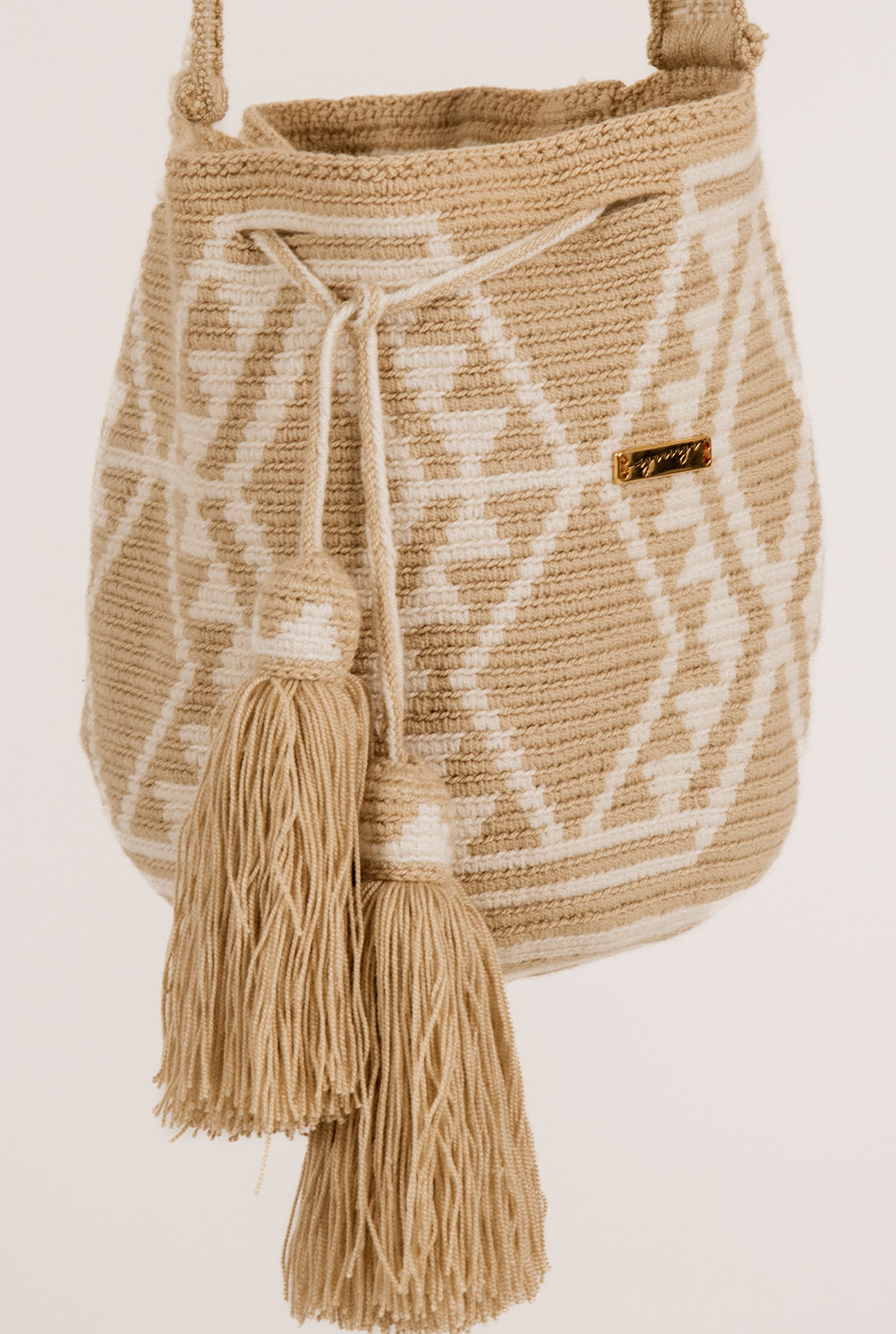 Mochila Wayuu tejida a mano en tonos beige y crudo, con un diseño suave y fácil de combinar. Ligera, cómoda y perfecta para el día a día, es ese complemento artesanal que suma calidez y estilo natural a cualquier look.